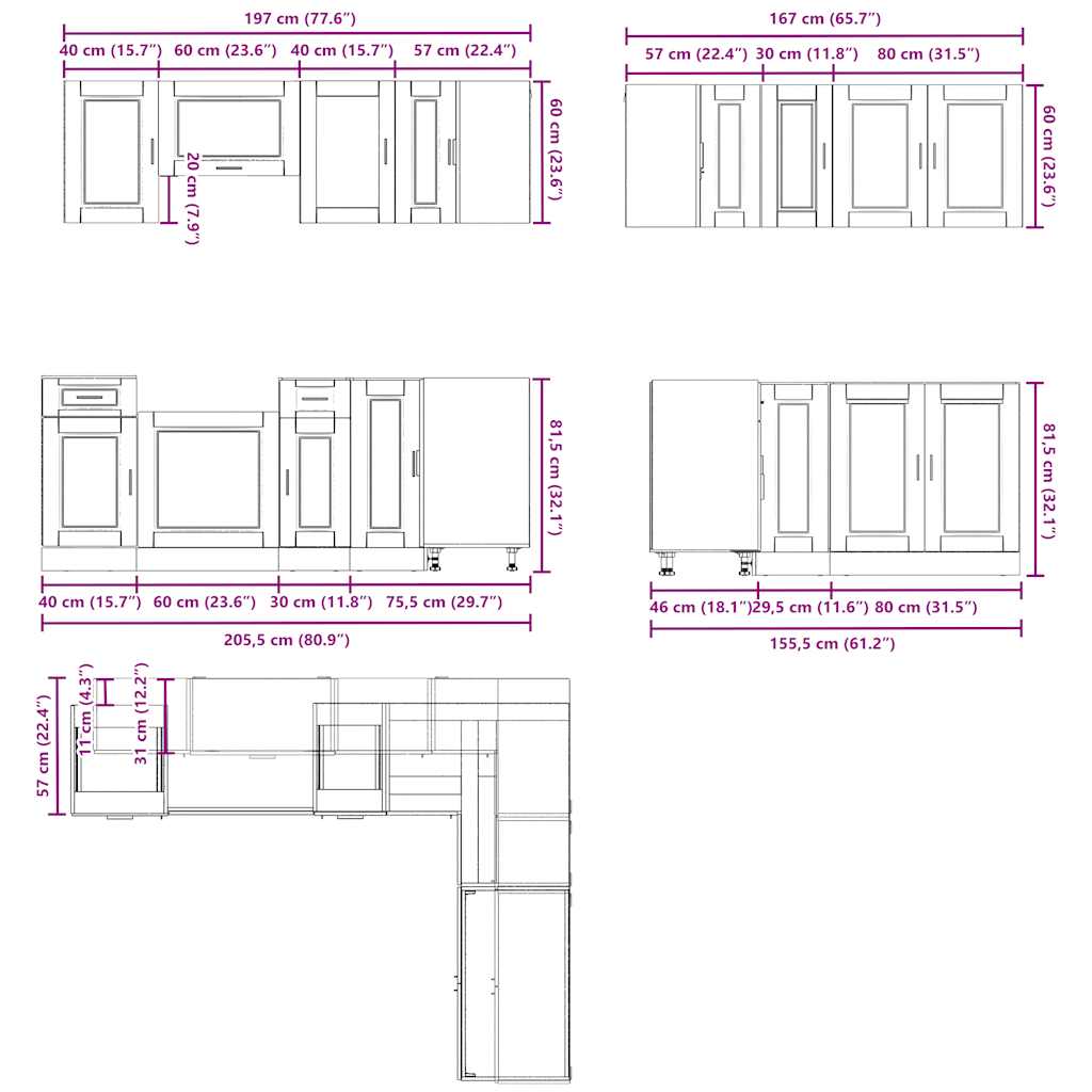- 1 x kitchen corner base cabinet: 75.5 x 75.5 x 81.5 cm (W x D x H)