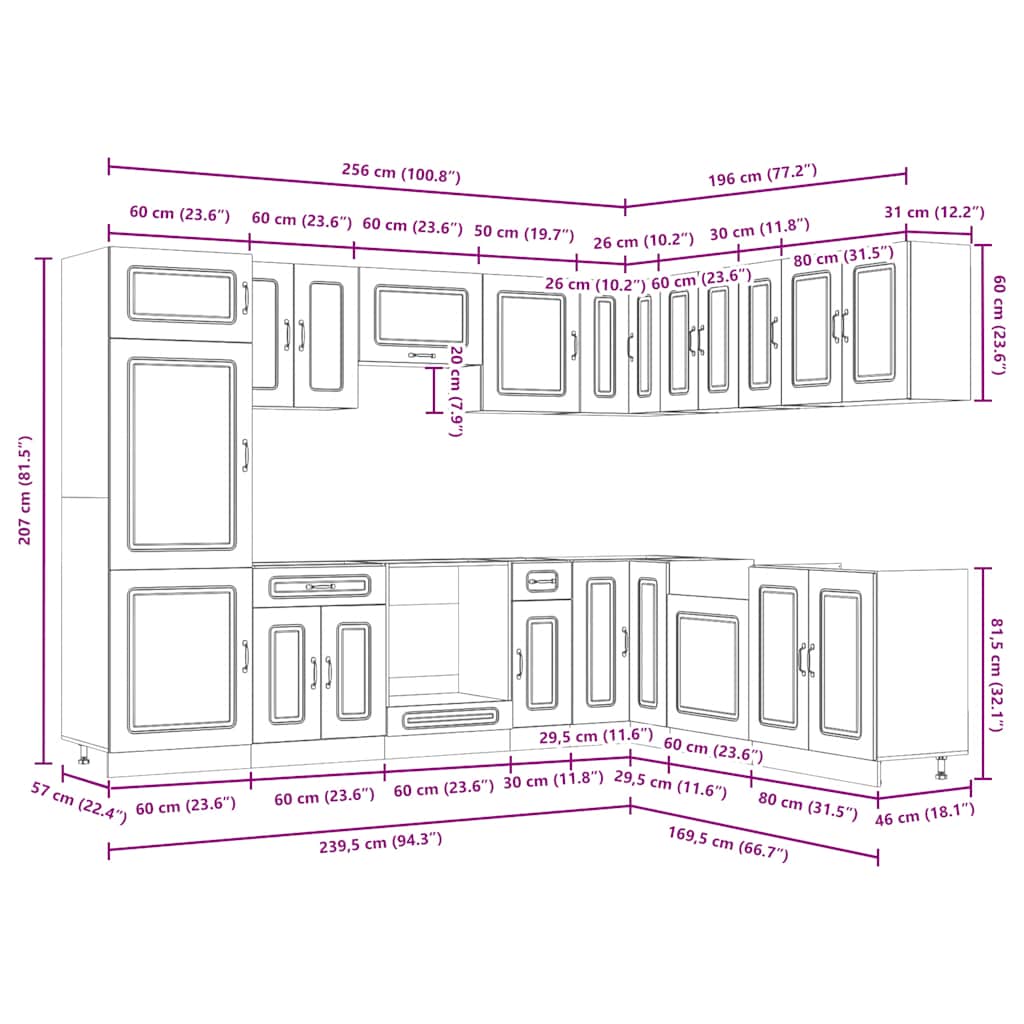 This 14-piece kitchen cabinet set, with its elegant design, optimises your kitchen space and provides ample storage space for your personal belongings! Stable and durable material: Engineered wood is a durable and stable material with a smooth surface that is resistant to moisture, warping, and splitting, making it a reliable choice for a variety of projects.Ample storage space: The kitchen cabinet set has many compartments, and offers sufficient space to store bowls, plates, pots, and other kitchen appliances.Adjustable feet: The bottom cabinets feature adjustable feet that can be adjusted in height to suit your kitchen layout.Easy to maintain: Thanks to its smooth surface, these kitchen cabinets are easy to clean with a damp cloth and require less maintenance. Warning:This product must be secured by installing a worktop. Good to know:Screw(s) and plug(s) for inside the wall are not included. Seek and use screw(s) and plug(s) suitable for your walls. If you are uncertain, seek professional advice. Read and follow each step of the instruction carefully.The worktop, sink and faucet are not included in the delivery.