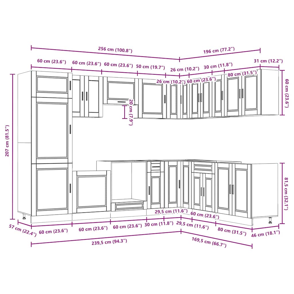 This 14-piece kitchen cabinet set, with its elegant design, optimises your kitchen space and provides ample storage space for your personal belongings! Stable and durable material: Engineered wood is a durable and stable material with a smooth surface that is resistant to moisture, warping, and splitting, making it a reliable choice for a variety of projects.Ample storage space: The kitchen cabinet set has many compartments, and offers sufficient space to store bowls, plates, pots, and other kitchen appliances.Adjustable feet: The bottom cabinets feature adjustable feet that can be adjusted in height to suit your kitchen layout.Easy to maintain: Thanks to its smooth surface, these kitchen cabinets are easy to clean with a damp cloth and require less maintenance. Warning:This product must be secured by installing a worktop. Good to know:Screw(s) and plug(s) for inside the wall are not included. Seek and use screw(s) and plug(s) suitable for your walls. If you are uncertain, seek professional advice. Read and follow each step of the instruction carefully.The worktop, sink and faucet are not included in the delivery.