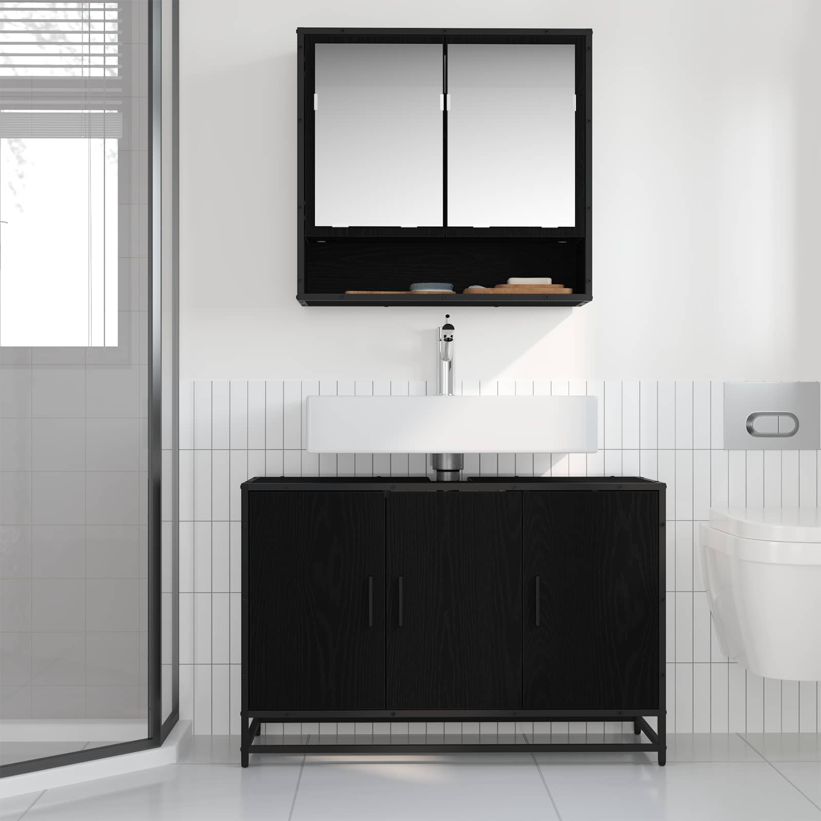 This Modern Bathroom Cabinet seamlessly combines practicality with a sleek, minimal design. Providing an elegant solution for keeping your bathroom organized, this cabinet boasts a compact size making it an optimal fit for bathrooms of any size. With a smooth, modern aesthetic characterized by its clean lines, this cabinet complements contemporary interiors flawlessly, offering an attractive and functional centerpiece to arrange bathroom essentials neatly. Engineered Wood Structure: The cabinet is crafted from durable engineered wood, meticulously selected for its blend of resilience and sleek appearance. This material ensures a steady and long-lasting construction that withstands daily use while exuding a polished look, making it a go-to choice for modern bathrooms. Matte Steel Handles: Equipped with matte black steel knobs, these handles are both functional and stylish, providing a secure grip while adding a touch of sophistication. Their non-reflective finish contributes to the overall modernity, enhancing the cabinet's sleek appeal. Innovative Storage Solutions: Featuring ample storage compartments, this cabinet caters to varied storage needs, efficiently organizing towels, toiletries, and other essentials. It is designed to maximize space while ensuring that everything you need is within easy reach, promoting a clutter-free environment. Assembly Made Easy: Assembly is required by two people using a screwdriver. This ensures that the cabinet is securely put together, maintaining its functionality and aesthetic value, making it a dependable piece of your bathroom setup. Care &Maintenance: Preserve its pristine condition by wiping the cabinet with a damp cloth as part of regular maintenance. This simple care routine ensures that the cabinet remains tidy and lends effortless style throughout its long lifespan.