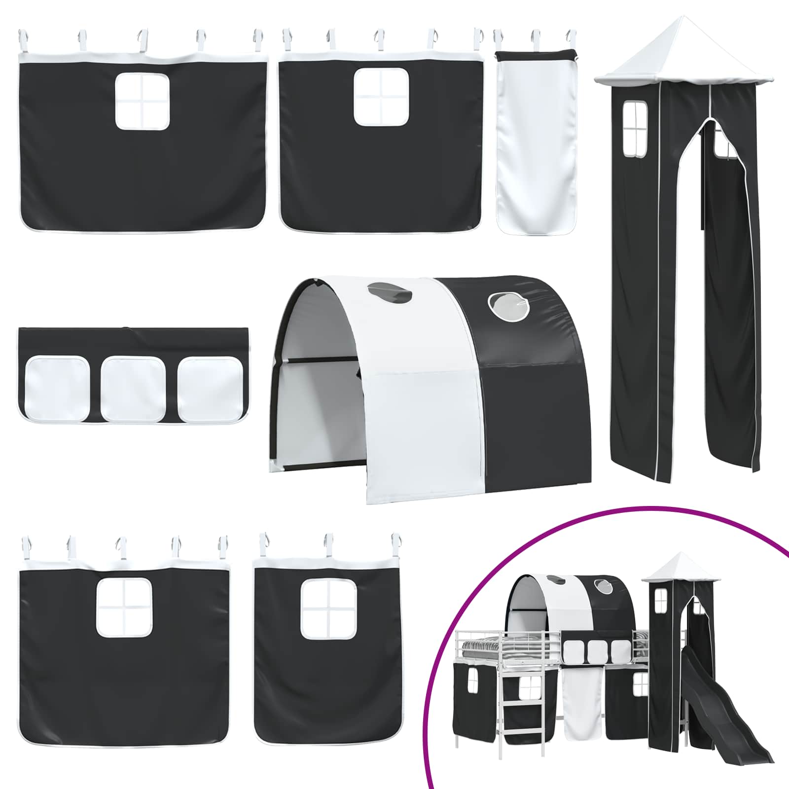 Kids'Loft Bed Frame with Curtains, Arch, Slide, Tower