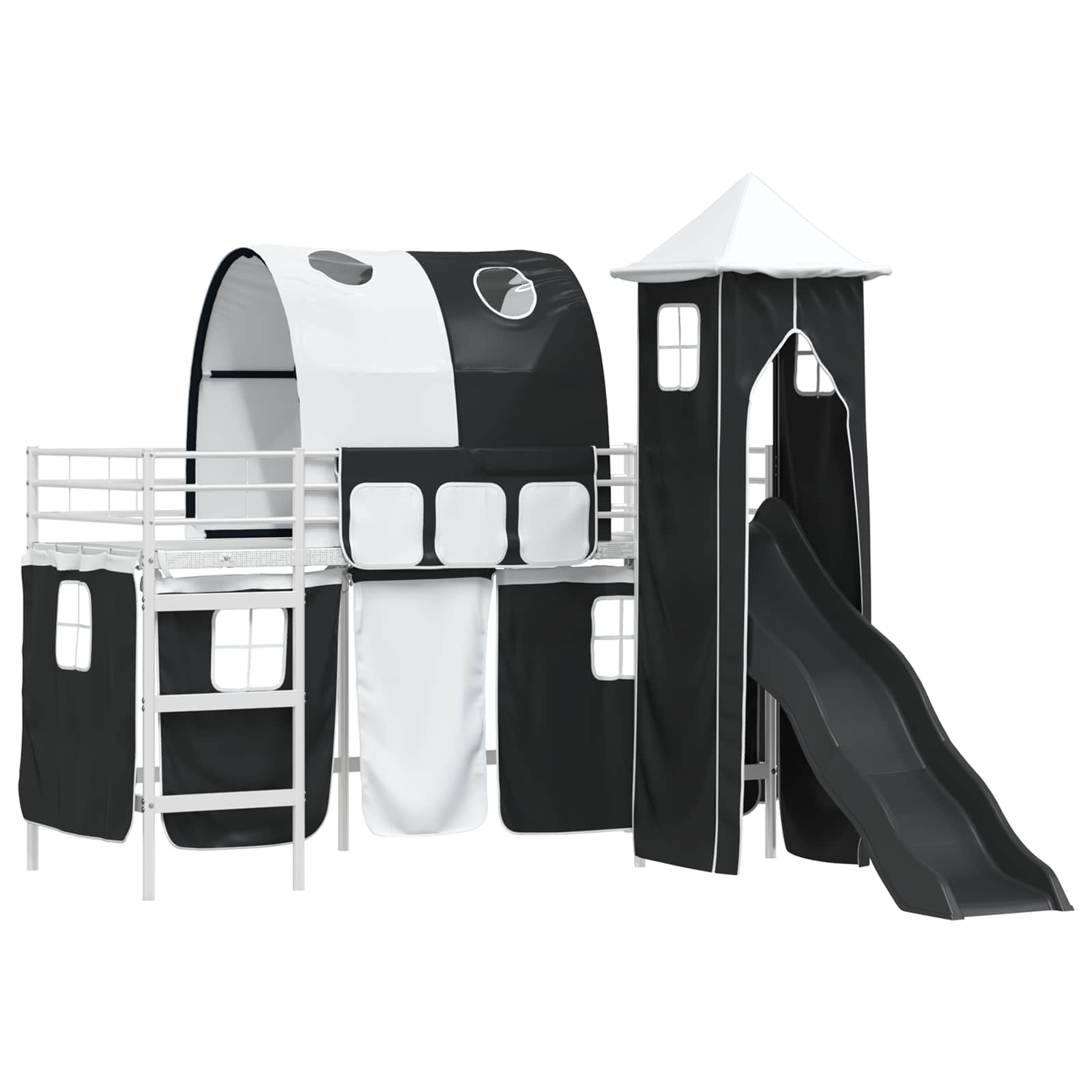 Kids'Loft Bed Frame with Curtains, Arch, Slide, Tower